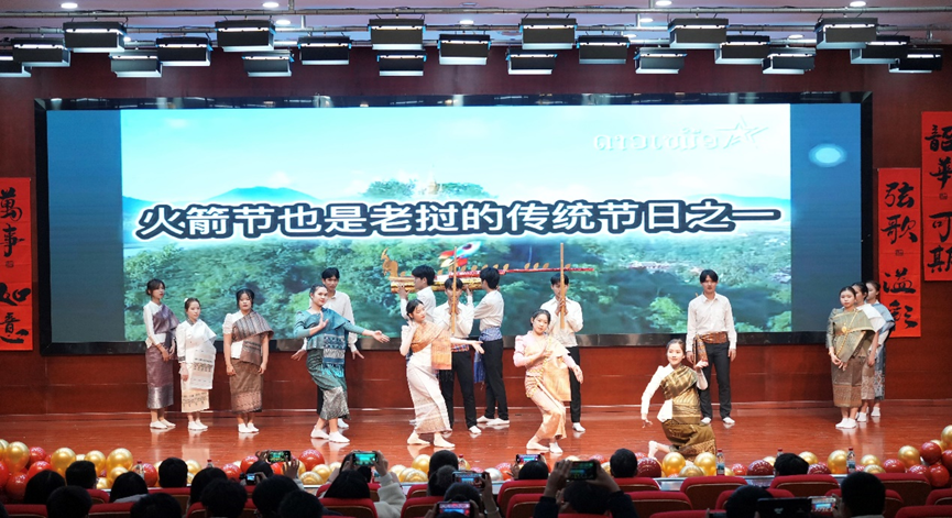 舞蹈《欢迎来到老挝》中,留学生们身着特色民族服饰,踏着独特舞步,搭配亲手制作的火箭、芦笙