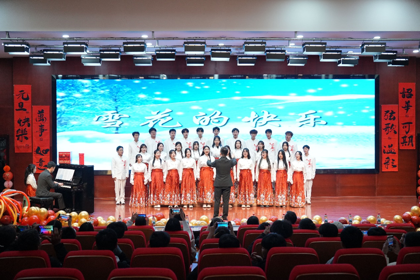 师范学院巴山艺韵艺术团・映山红合唱团带来的大合唱《雪花的快乐》,由杨济舟老师担任指挥、肖