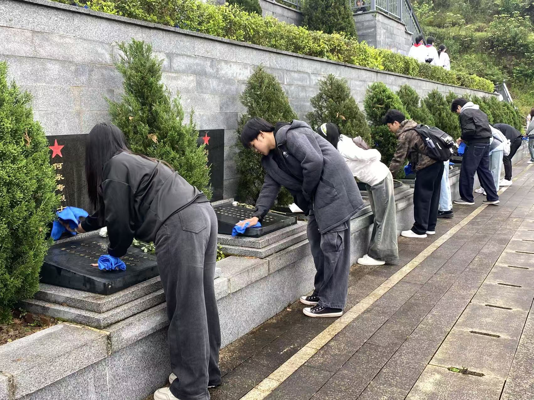 活动现场,全体人员身着素装,神情庄重肃穆而立。齐唱国歌后,向革命先烈集体默哀,表达无尽追思。随后,大家依次向烈士纪念碑敬献菊花,手持清洁帕,轻轻擦拭烈士墓碑,动作虔诚且专注;特别是在有序瞻仰烈士墓时认真聆听烈士事迹时,仿若置身那段波澜壮阔的革命岁月。