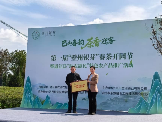 春茶吐绿,茶香四溢。 3月28日,“壁州银芽”春茶开园节暨通江县“助农惠民”特色农产品推广活动,在通江县民胜镇四丰茶场隆重举行,学院院长董铃及100多名师生参加了本次活动。 活动当日,茶园内人声鼎沸,热闹非凡。在开幕仪式上,达州职业技术学院与壁洲茶业共同揭牌 “ 达州职业技术学院产教融合基地 ”,双方合作迈入更深层次、更广领域的新阶段。 学院教